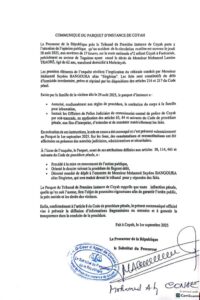 Accueil Justice Urgent : un mandat de dépôt décerné contre l’artiste Singleton depose ... Justice Urgent : un mandat de dépôt décerné contre l’artiste Singleton depose à la prison de coyah By Rédaction 1 septembre 2025 0 167 Partager Facebook Twitter Pinterest WhatsApp Partager Facebook Twitter Pinterest WhatsApp Article précédentReferendum du 21 Septembre : le BL de Faya Milimouno invite à voter “NON”Article suivantUrgent -Coyah : la demande de mise en liberté de Singleton rejetée, l’affaire renvoyée au 9 septembre. Rédaction RELATED ARTICLES Justice Traite des êtres humains : le TPI de N’Zérékoré rend son verdict. 23 janvier 2026 Justice Kankan : Kankan inaugure sa session criminelle 2026 : Marwane Baldé met en une justice libre . 22 janvier 2026 Justice CRIEF : le dossier Mandian Sidibé programmé ce mardi devant la Chambre spéciale de contrôle de l’instruction 20 janvier 2026 Most Popular Lettre ouverte à Makanera Kaké : « Reposez-nous ! » 31 janvier 2026 Traite des êtres humains : le TPI de N’Zérékoré rend son verdict. 23 janvier 2026 𝗔𝗰𝘁𝗲 𝗿𝗲𝗽𝘂𝗯𝗹𝗶𝗰𝗮𝗶𝗻 : 𝗹𝗲 𝗣𝗿𝗲𝘀𝗶𝗱𝗲𝗻𝘁 𝗱𝗲 𝗹𝗮 𝗥𝗲𝗽𝘂𝗯𝗹𝗶𝗾𝘂𝗲 𝗦𝗼𝗻 𝗘𝘅𝗰𝗲𝗹𝗹𝗲𝗻𝗰𝗲 𝗠𝗮𝗺𝗮𝗱𝗶 𝗗𝗢𝗨𝗠𝗕𝗢𝗨𝗬𝗔 𝗱𝗲𝗽𝗼𝘀𝗲 𝘀𝗮 𝗱𝗲𝗰𝗹𝗮𝗿𝗮𝘁𝗶𝗼𝗻 𝗱𝗲 𝗯𝗶𝗲𝗻𝘀 𝗮 𝗹𝗮 𝗖𝗼𝘂𝗿 𝘀𝘂𝗽𝗿𝗲𝗺𝗲. 22 janvier 2026 Guinée : le Président Mamadi Doumbouya acte la démission du Gouvernement et annonce un nouveau cycle politique. 22 janvier 2026 Voir plus
